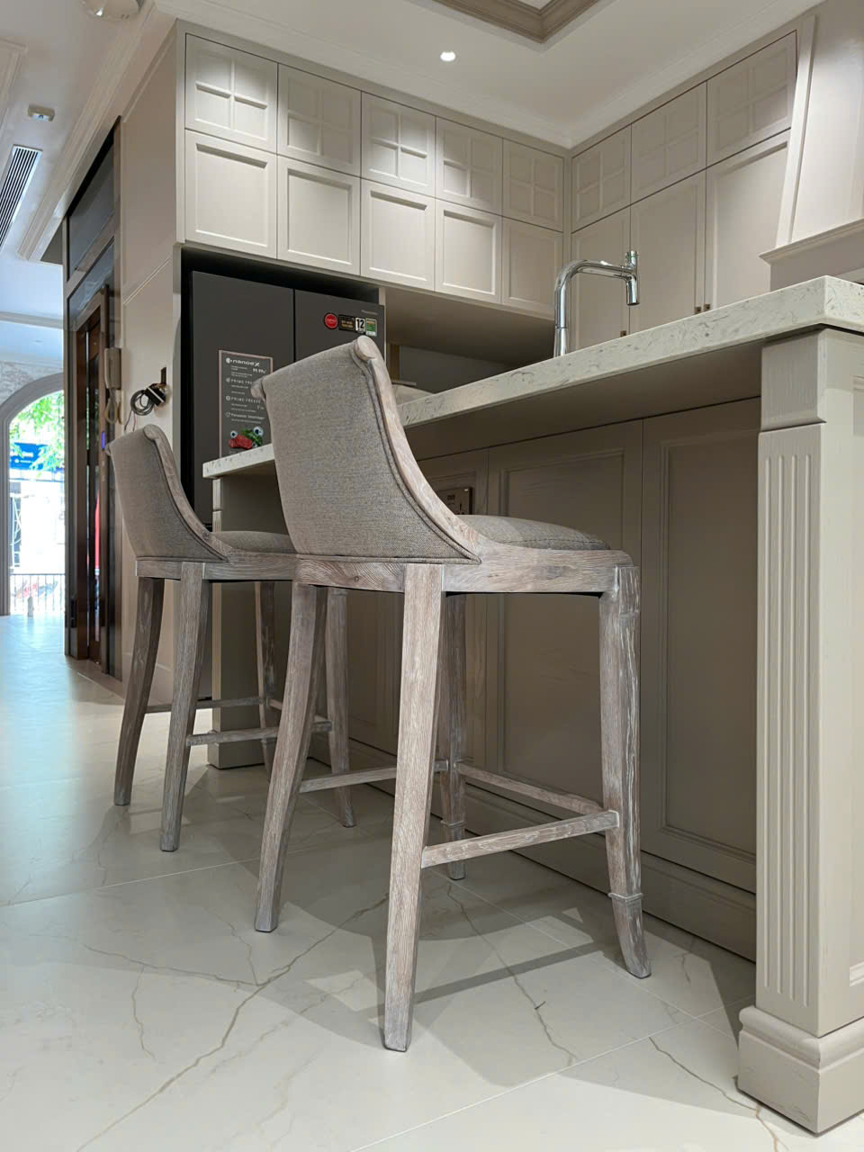 Phom ghế gọn gàng, tỷ lệ hài hòa với chiều cao bàn đảo