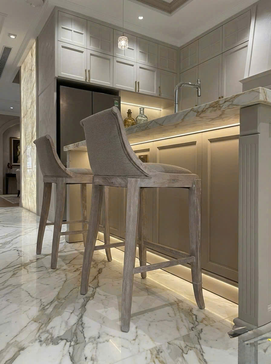 Phom ghế gọn gàng, tỷ lệ hài hòa với chiều cao bàn đảo